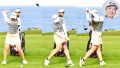 バックスイングでは、スイングの軸をふどうにして、ゆっくりと大きくクラブをあげてトップを形成し、ダウンスイングでは、経時的にスイング軸を変化させているが、その場で腰を回転させている。インパクトでジャンピングしてスピードを加速させているのが山下美夢有の特徴あるスイングです。